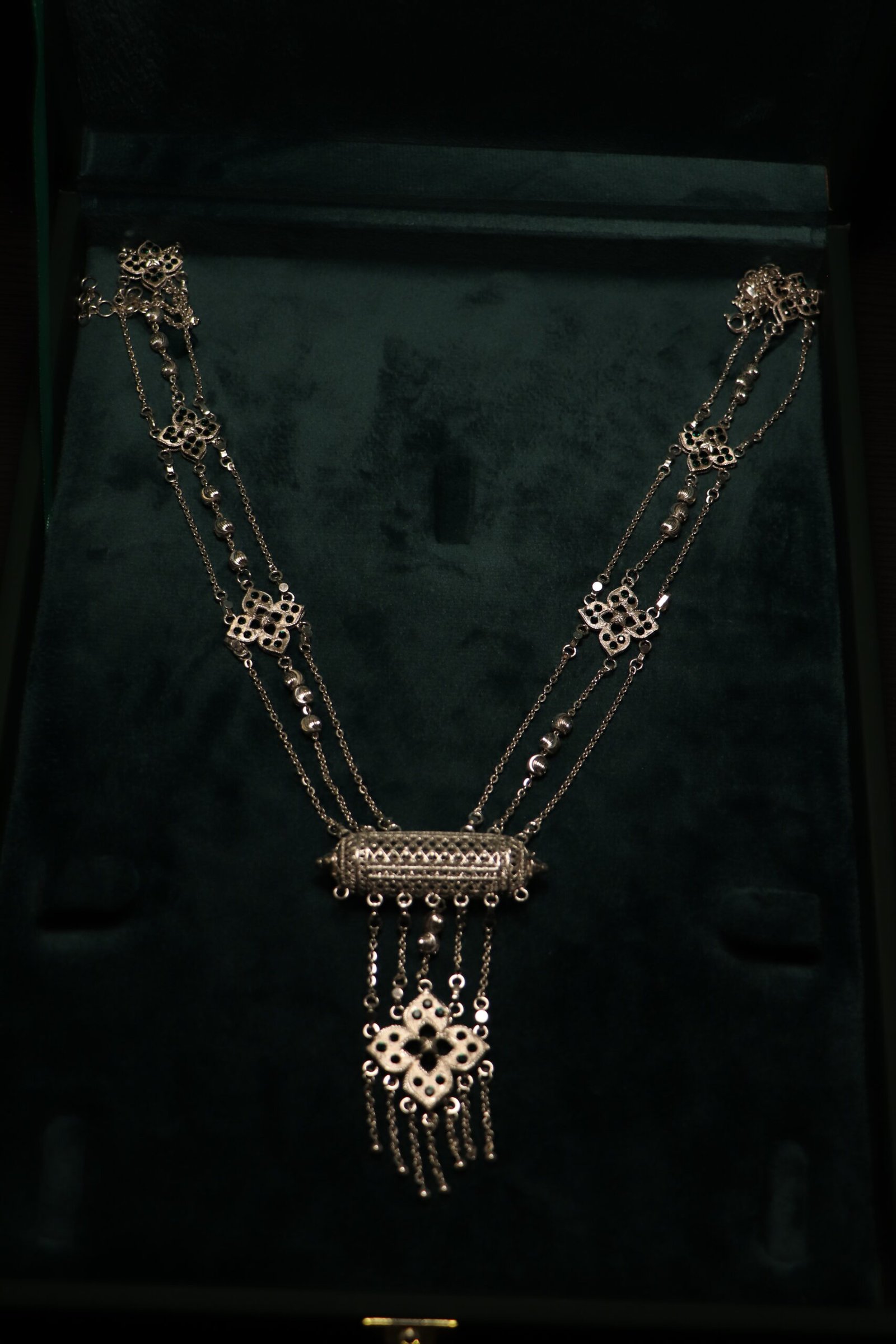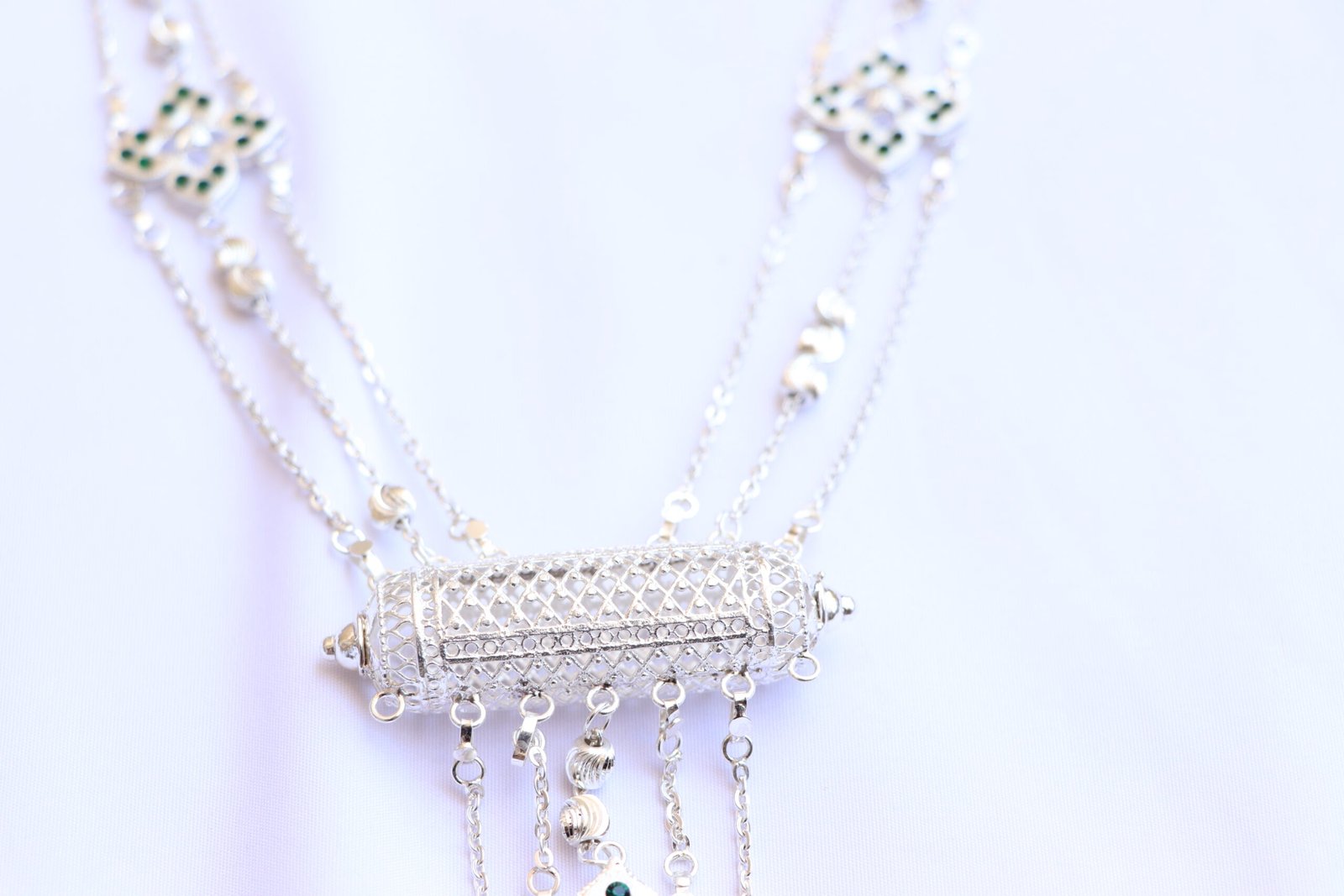 - التفاصيل الزخرفية: نقوش معدنية دقيقة وحبيبات فضية صغيرة وسلاسل رفيعة تمنح التصميم عمقًا بصريًا مميزًا