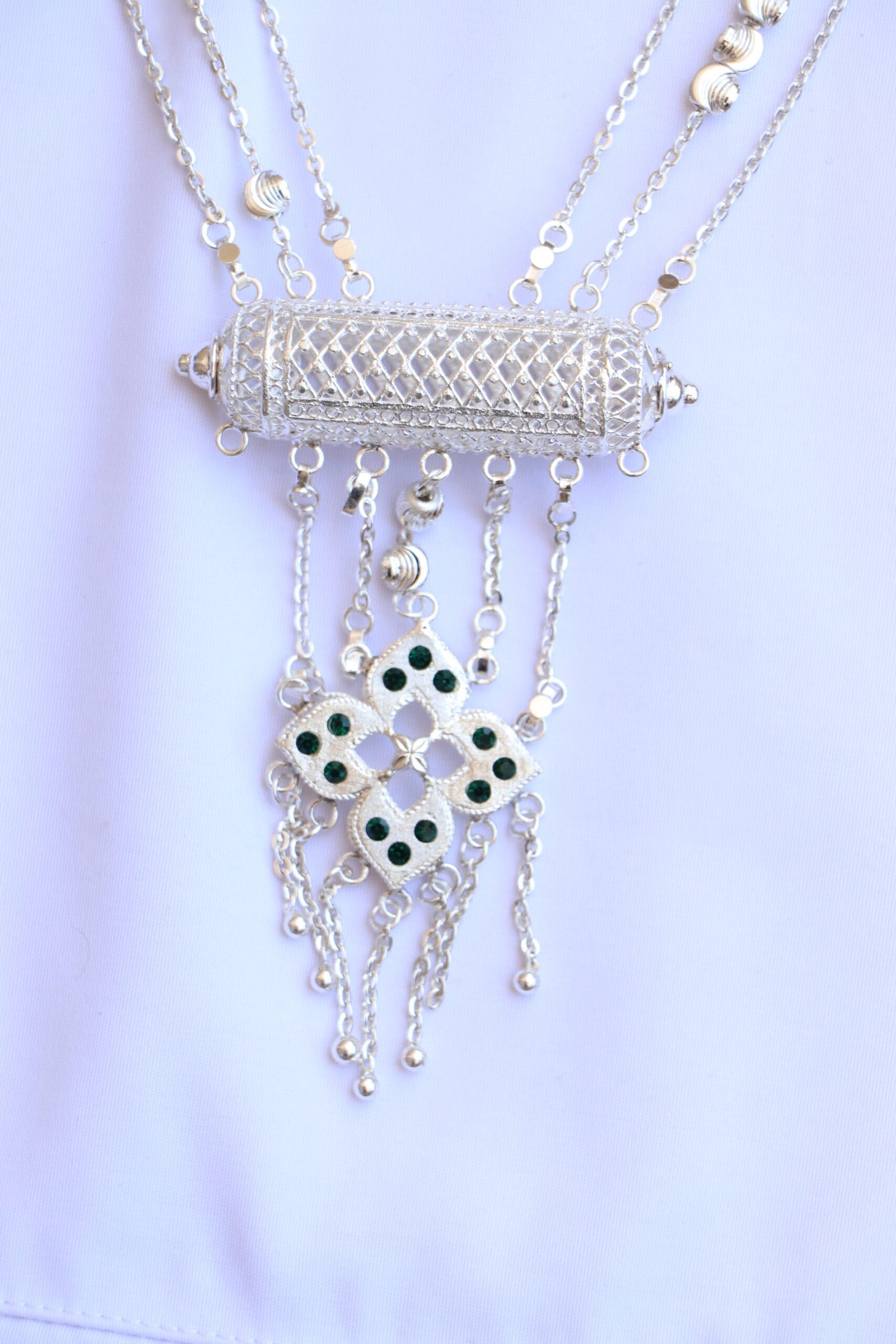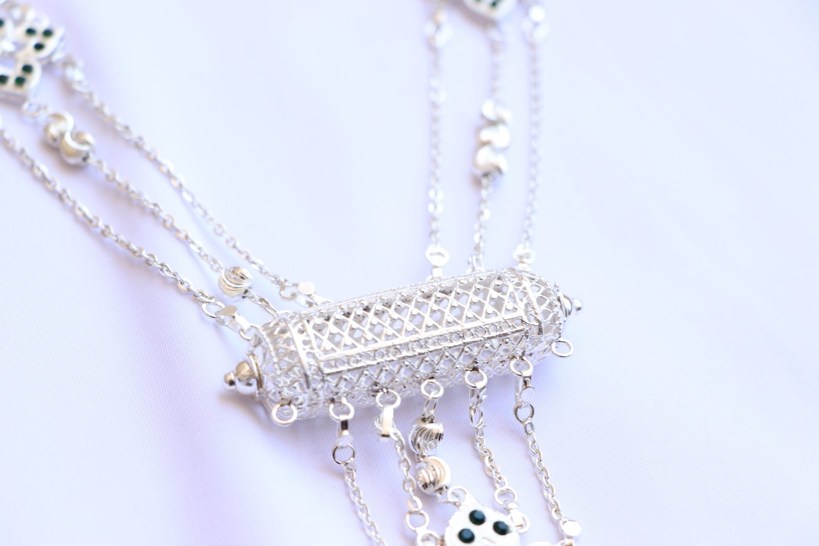 - النقوش المعدنية الدقيقة والحبيبات الفضية تمنح العقد عمقًا بصريًا وجاذبية فريدة.
