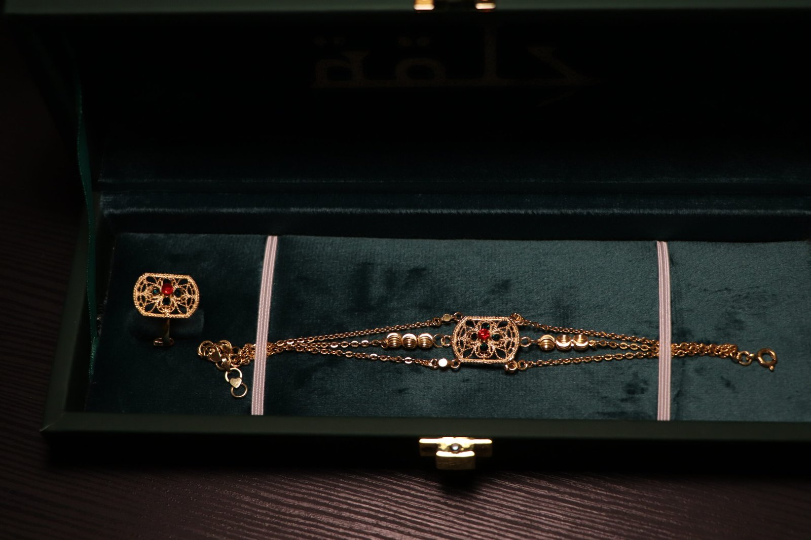 طقم اسوره وخاتم ذهب 1 بتصميم متعدد الطبقات من كل طرف وفصوص حمراء جذابة، ليضيف لمسة فاخرة وعصرية على معصمك وأصابعك. صُمم ليجمع بين الأناقة والجودة، ويكون خياراً مثالياً للمناسبات اليومية والخاصة.