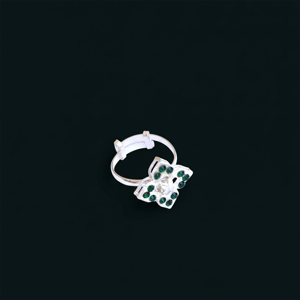 - التصميم: حجر أخضر مزخرف في وسط الخاتم، يحيط به تصميم فضي ناعم