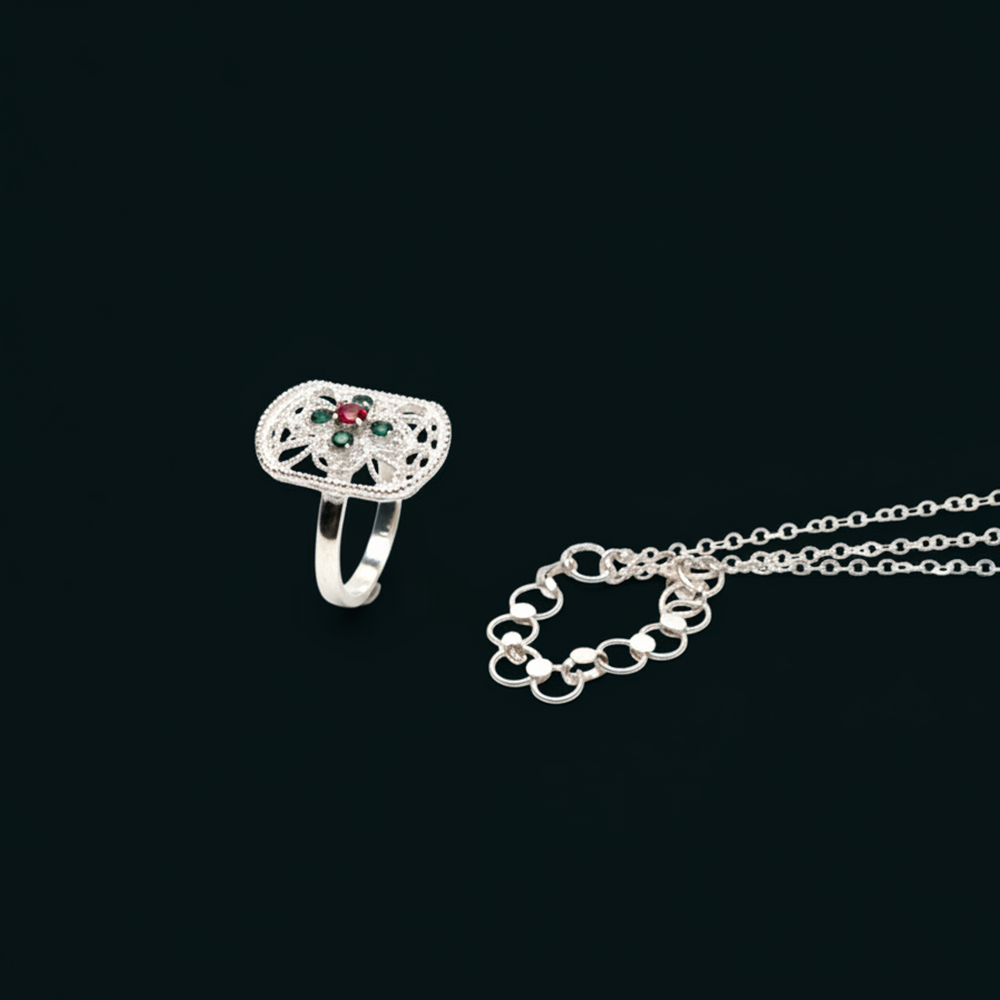 خاتم فضة من حلقة، تصميم فاخر يجمع بين الفضة اللامعة والأحجار الكريمة. مع لمسة من الأناقة والجمال، هذا الخاتم هو الخيار المثالي لإضافة لمسة من الفخامة لكل إطلالة.