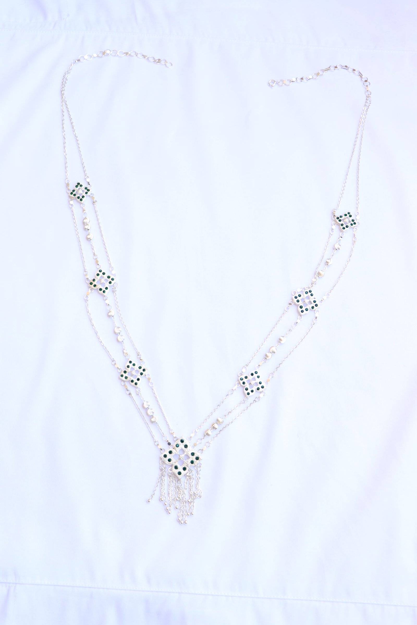 - عقد فضي بثلاث سلاسل رفيعة متصلة بالعقد تضيف توازنًا فنيًا وحركة سلسة لكل خطوة.